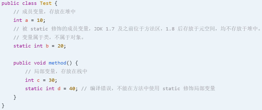⚠️ 注意:基本数据类型存放在栈中是一个常见的误区! 基本数据类型的存储位置取决于它们的作用域和声明方式。如果它们是局部变量,那么它们会存放在栈中;如果它们是成员变量,那么它们会存放在堆/方法区/元空间中。