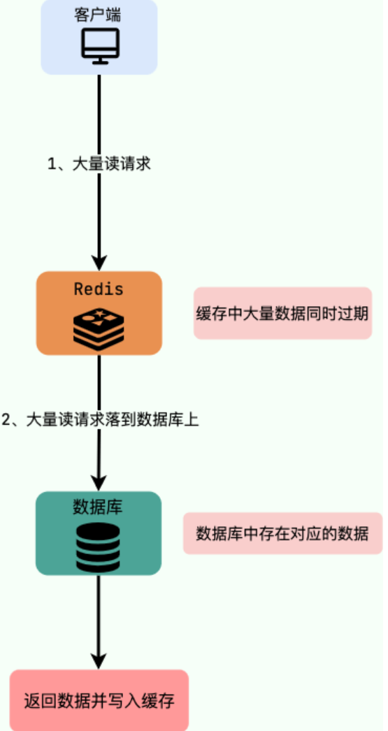 实际上,缓存雪崩描述的就是这样一个简单的场景:缓存在同一时间大面积的失效,导致大量的请求都直接落到了数据库上,对数据库造成了巨大的压力。 这就好比雪崩一样,摧枯拉朽之势,数据库的压力可想而知,可能直接就被这么多请求弄宕机了。