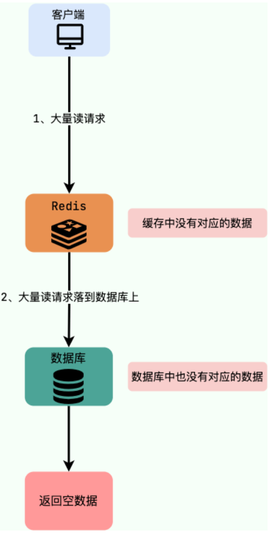 缓存穿透说简单点就是大量请求的 key 是不合理的,根本不存在于缓存中,也不存在于数据库中。这就导致这些请求直接到了数据库上,根本没有经过缓存这一层,对数据库造成了巨大的压力,可能直接就被这么多请求弄宕机了。