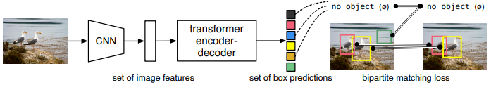 提出一种全新的基于集合的损失函数: 通过二分图匹配的方法强制模型输出一组独一无二的预测框,每个物体只会产生一个预测框,这样就将目标检测问题直接转换为集合预测的问题,所以才不用nms,达到端到端的效果。
